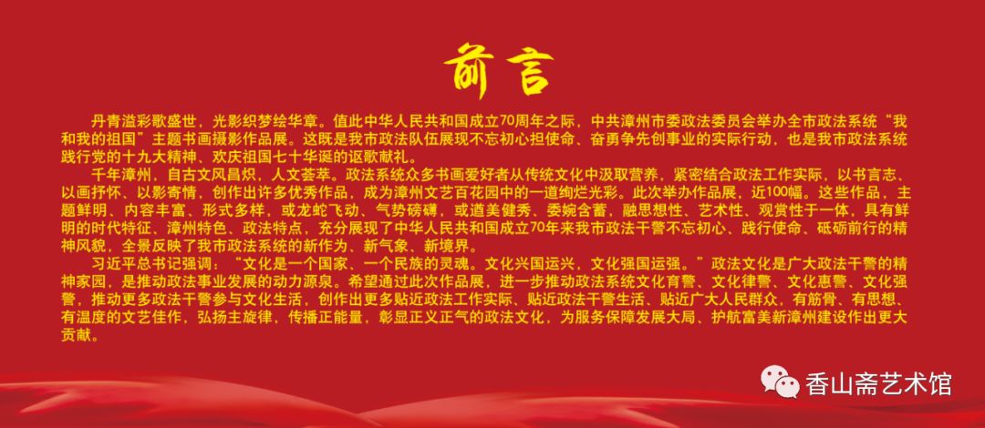 由中共漳州市委政法委员会、漳州市文学艺术界联合会共同主办的漳州市政法系统 “我和我的祖国"主题书画摄影作品巡展(东山站)将于2019年10月28日∽11月1日在东山县香山斋艺术馆展出,诚邀您届时莅临参观指导!
