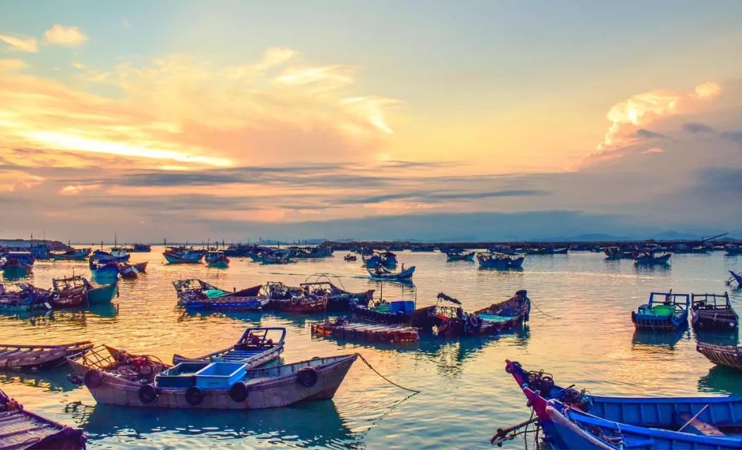 破晓时分的渔港,绯红的朝霞,洒满光辉的大海,还有停靠在岸边的渔船,构成了光影的大片。
