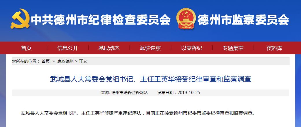 武城县人大常委会党组书记、主任王英华涉嫌严重违纪违法,目前正在接受德州市纪委市监委纪律审查和监察调查。
