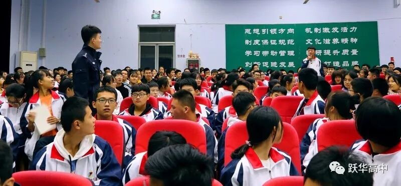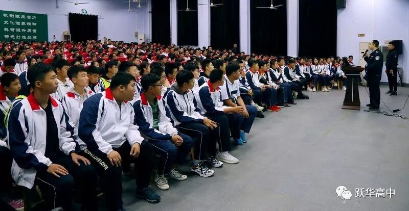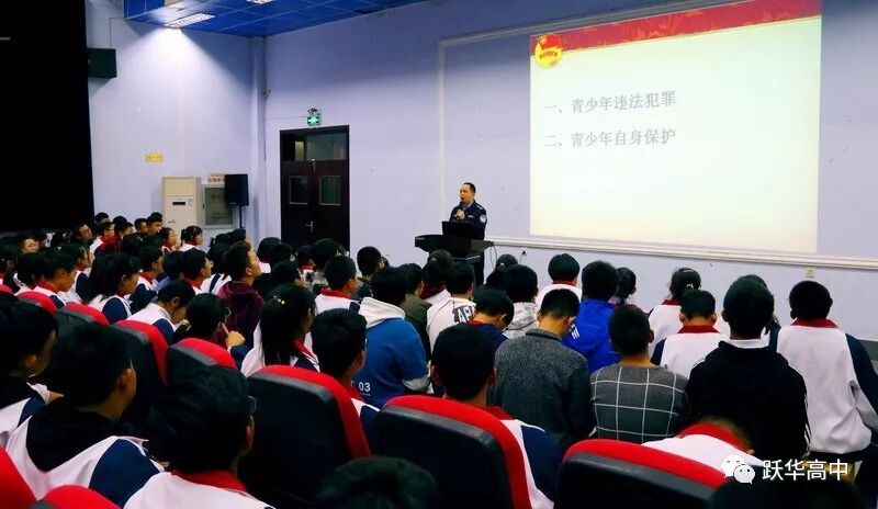 为深入开展法制宣传教育,弘扬社会主义法治精神,进一步培养学生的法制观念,努力构建和谐、平安、文明校园。2019年10月26日晚跃华学校高中部开展了“青少年法制教育讲座”。本次讲座特邀宋官屯派出所警官对我校高一年级学生进行法制教育宣传。