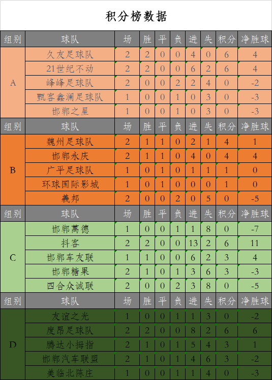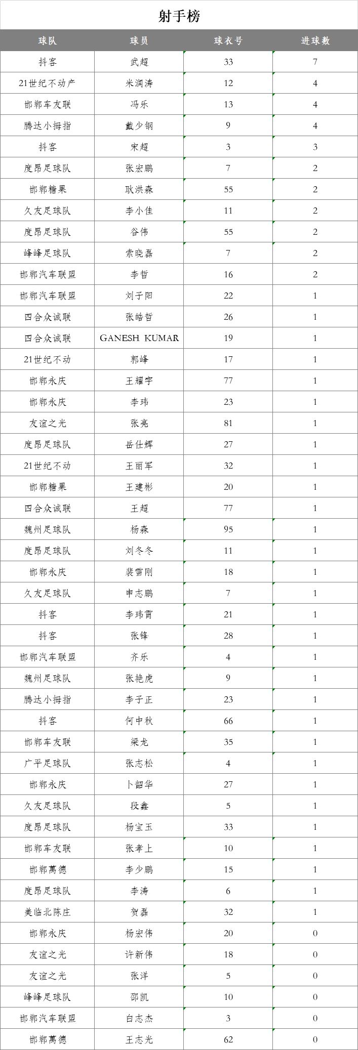 2019“中国足球发展基金会杯”中国职工足球联赛(华北赛区河北邯郸赛区赛)暨爱八草根足球联赛邯郸赛区职工业余足球联赛一周比赛数据