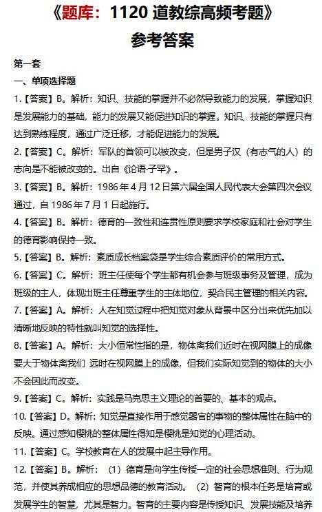 翻阅了大量教综资料和考试题库,特别挑选了28套教综题,每套题包含20道单选题、10道多选题和10道判断题,合计1120道教综经典考题。最关键的是,不管题目难还是容易,每1道题都配有详细的解析,做错了你能很快知道自己错在哪,做对了也能顺便巩固下知识点。其中题本总共143页,答案总共122页。题库资料是电子版,免费领取后可自行打印题本和答案,仅限量1120份,超过后领取入口马上关闭。祝顺利上岸。
