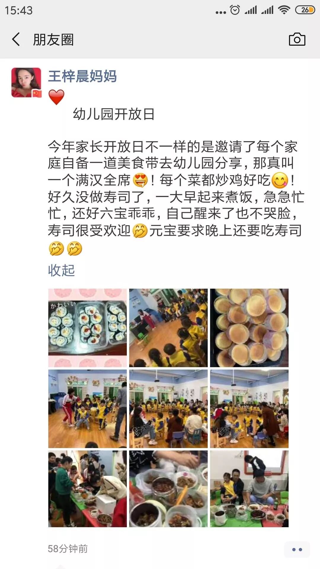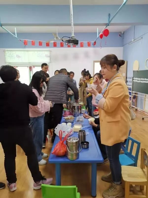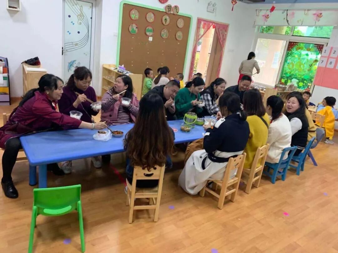 游戏结束后,到了小朋友、家长和老师一起共进午餐的环节:菜品丰富,热闹非凡!孩子们首次体验到了和全班的小伙伴、全班家长、全班老师一起进餐的开心和愉悦!家长们也因为孩子这根纽带,以“美食分享”为媒介,从相识才不过两个月就迅速拉近了心与心的距离,彼此成为了好朋友。
