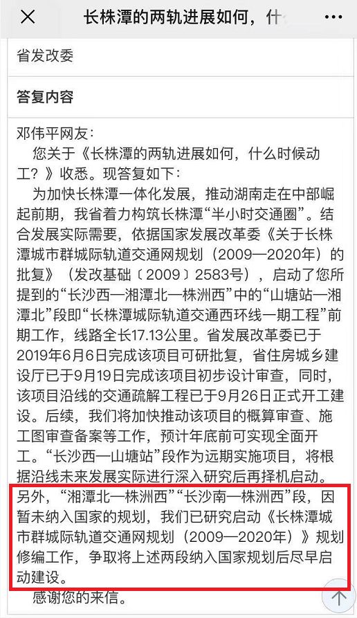 近期,有市民在省长信箱咨询“长沙西-湘潭北-株洲西”和“长沙南-株洲西”两条轨道快线的相关工作,省发改委官方回复为: