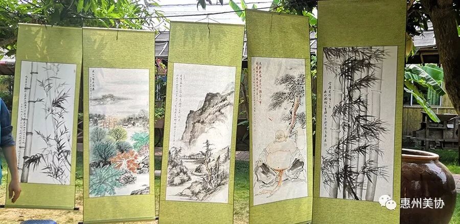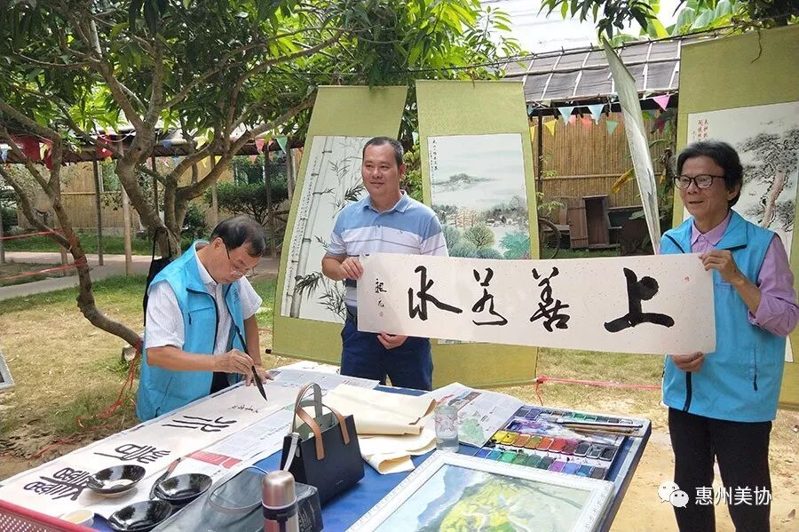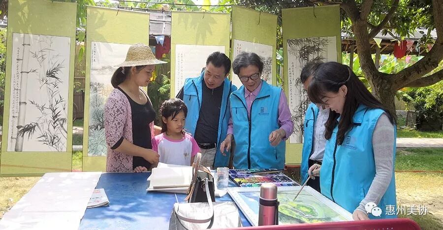 一进水口村委会,画家们就摆开早已准备好的书画作品和文房四宝,把现场装点成一个小型简易的书画展览,吸引了村委会管理人员和一些群众的围观。有些村民观赏着画作,有些观看画家现场挥毫。一位带着小女儿的母亲,边看边问,母女久久不愿离去。许多村民希望能多举办这样的活动,让自己和孩子们得到高雅艺术的薰陶。画家们一边挥笔作画,一边耐心地为村民讲解如何欣赏中国画,以及练习书法选帖、临帖、读帖等多方面基础知识。