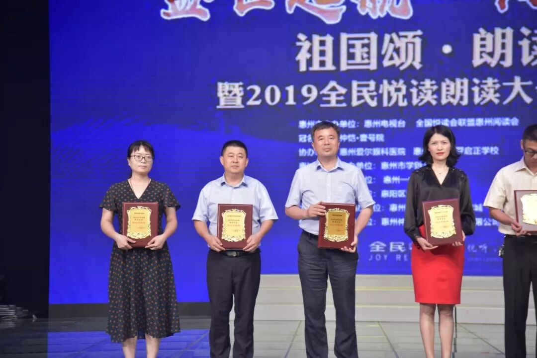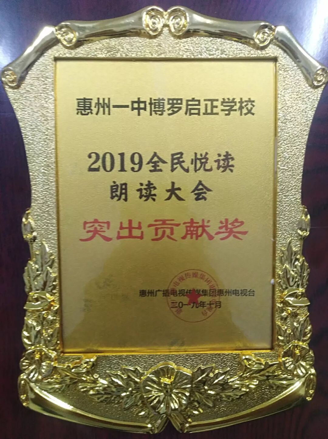 时值金秋,天高气爽,经过数月的紧张准备和激烈角逐,2019全民悦读朗读大会终于落下帷幕。经过我校师生及相关工作人员的不懈奋斗,我校获得了“突出贡献奖”。惠州一中博罗启正学校小学部校长陈永军代表学校上台领奖。