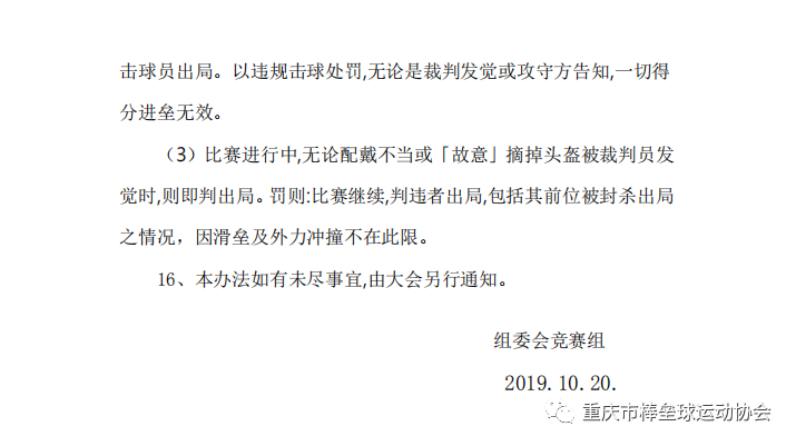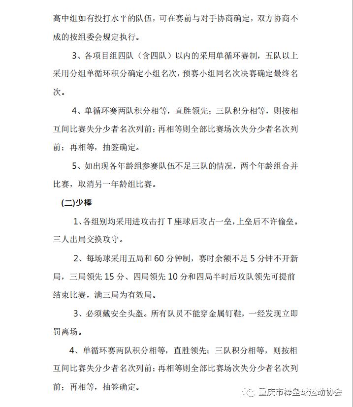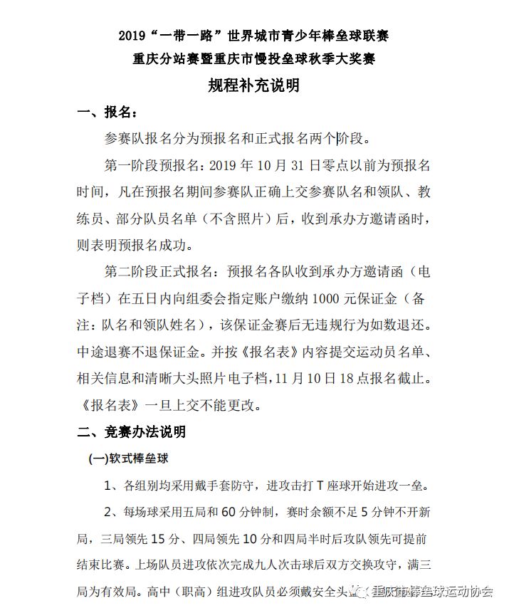 2019“一带一路”世界城市青少年棒垒球联赛 重庆分站赛暨重庆市慢投垒球秋季大奖赛规程补充说明