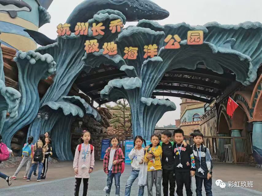 “杭州长乔极地海洋公园”几个大字,它们在阳光下闪闪发光。先摆个pose合个影,跟着导游姐姐,我们排着队进入了公园。