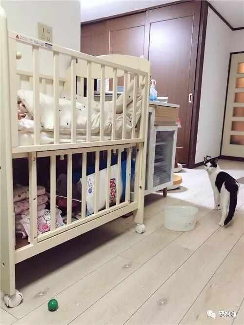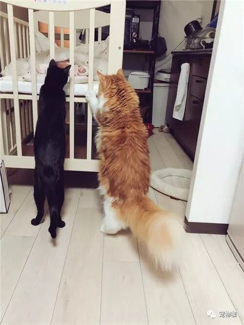 两只毛球趴在婴儿床边津津有味地看着眼前这位家庭新成员。