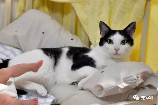 很快就混熟的小宝宝和猫咪们,彼此都渐渐习惯了这种特别的陪睡体制,