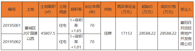 2019年10月21日-27日,本周土拍仅1宗成交,为襄土网挂字[2019]50号,该地块包含两副地,由襄投置业旗下全资子公司襄阳月月欣欣房地产开发有限公司竞得,土地成交面积45807.5㎡,成交金额28588.22万元。