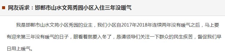 网友诉求:邯郸市山水文苑秀园小区入住三年没暖气