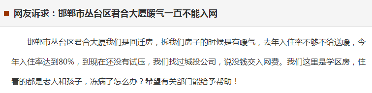 网友诉求:邯郸市丛台区君合大厦暖气一直不能入网