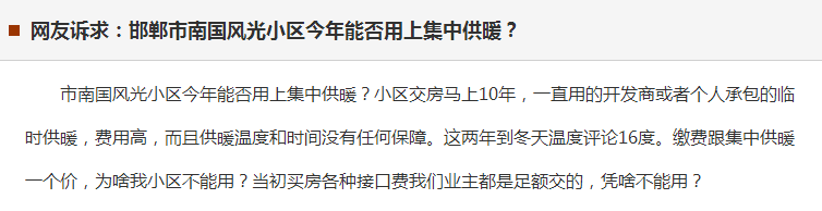 网友诉求:邯郸市南国风光小区今年能否用上集中供暖?