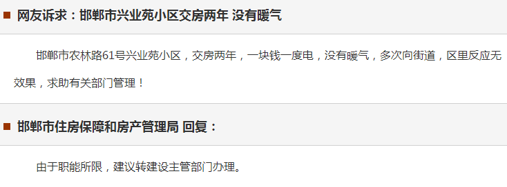 邯郸市农林路61号兴业苑小区,交房两年,一块钱一度电,没有暖气,多次向街道,区里反应无效果,求助有关部门管理!