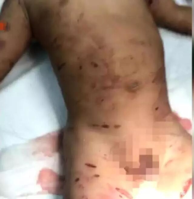 小孩目前伤势比较严重,小孩除开脸上没有受伤,其部位均有不同程度的受伤,可以说是体无完肤,情况非常的凄惨。目前小孩已经被送往医院进行救治,由他的父亲在照看他。
