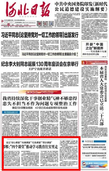 今日,河北日报头版刊登“邯郸:‘四个课堂’推动学习教育往实里走”。四个课堂分别是“初心课堂”“先锋课堂”“红色课堂”“警示课堂”……