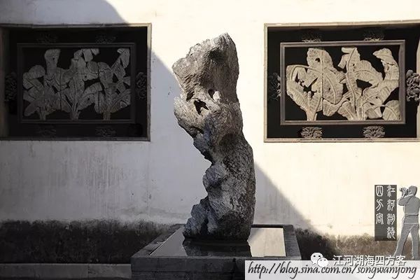 芭蕉厅原是张家餐厅,因气韵生动的芭蕉木雕而得名。庭院中是一块名石,因形似苍鹰凌空腾飞得名“鹰石”。此石与啸石和美女照镜石并称南浔三大名石。