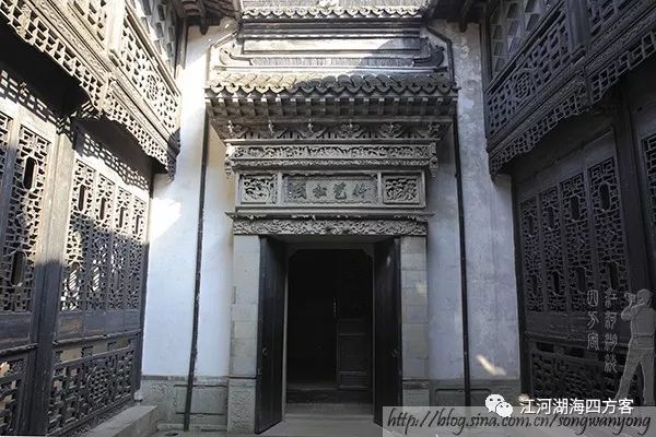 内厅是女眷接待客人之处,楼上为女眷居住之所。内厅的两边有厢楼,中间是天井,在与大厅连接处建有砖雕门楼,门楼砖雕繁复精美,“竹苞松茂”四字出自晚清书法家吴淦。楼上窗户用的是从法国进口的蓝晶刻花玻璃,这在当时绝对是极为稀罕之物,非大富之家置办不得。凭此,张石铭旧居在砖雕、石雕、木雕之外还多了个玻璃雕,凑成了‘四绝’。